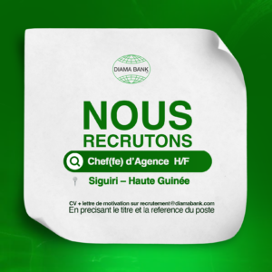 Dans le cadre du renforcement de son réseau et de l’ouverture prochaine de son agence dans la ville de Siguiri, DIAMA BANK SA lance un appel à candidature pour le poste de Chef(fe) d’Agence.